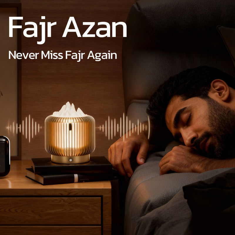 An intelligent Azan speaker with ambient light and an aroma stone diffuser — designed to blend seamlessly into your home.